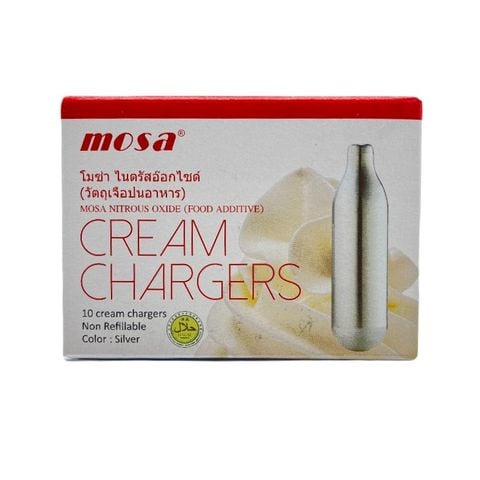 Viên Gas Kem Tươi N2O Mosa 10 Viên/hộp, gas làm kem được làm bằng 100% thép tái chế, được mạ an toàn, không bơm lại và chứa khoảng 8 gram thực phẩm tinh khiết – lớp N2O.